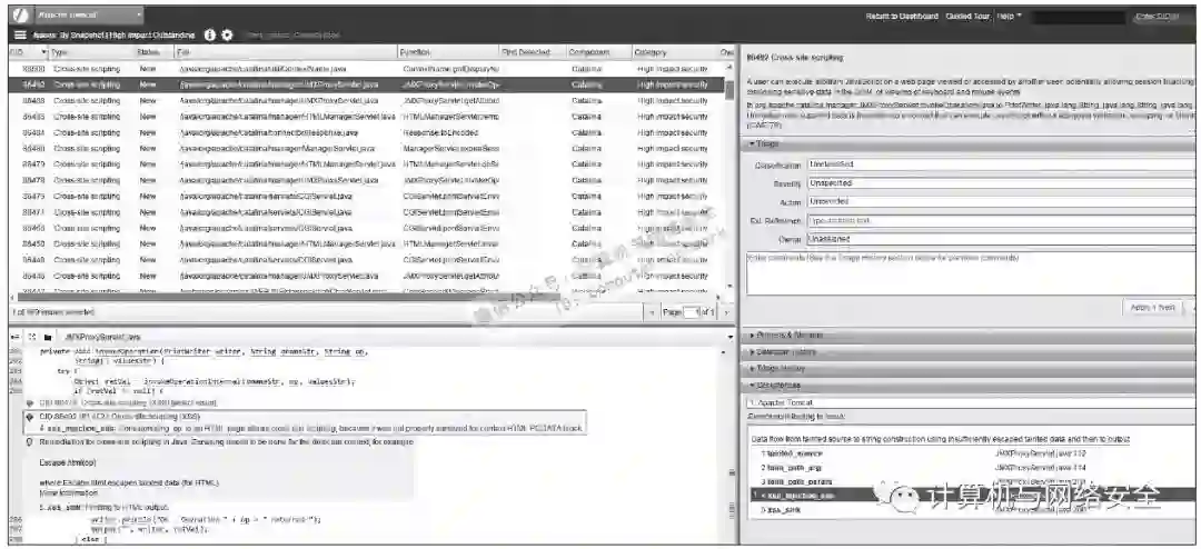 对于代码量大的产品,人工审计明显不能满足需求,这时需要寻求工具的帮助。代码分析技术由来已久,1976年科罗拉多大学的Lloyd D.Fosdick和Leon J.Osterweil在ACM Computing Surveys上发表了著名的Data Flow Analysis in Software Reliability论文,其中就提到了数据流分析、状态机系统、边界检测、数据类型验证、控制流分析等技术。随着计算机语言的不断演进,代码分析技术也在日趋完善。目前有数量众多的开源和商业源码审计工具建立在这些分析技术之上,其中包括Foritify,Coverity,FindBugs等。这些自动化的代码审计产品能够满足对审计量和强度的要求,并且大多提供和开发环境相整合的组件,可以融入到日常的开发和编译过程当中。工具不可避免会产生漏报和误报,在处理工具生成的报告时,需要人工对生成的结果进行验证。
