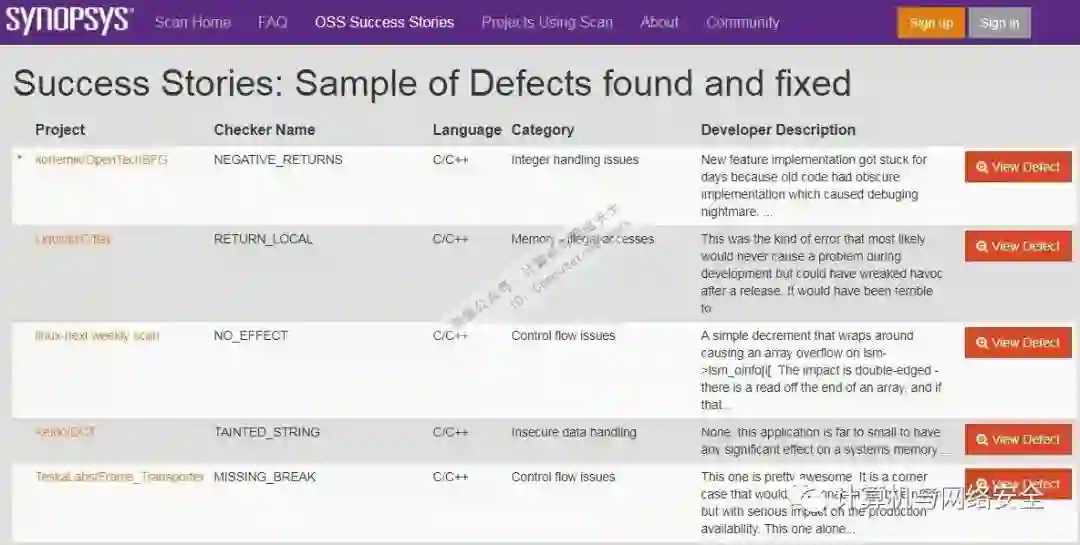 https://scan.coverity.com/o/oss_success_stories中包含甄选出通过Coverity发现的漏洞列表,如图2所示。
