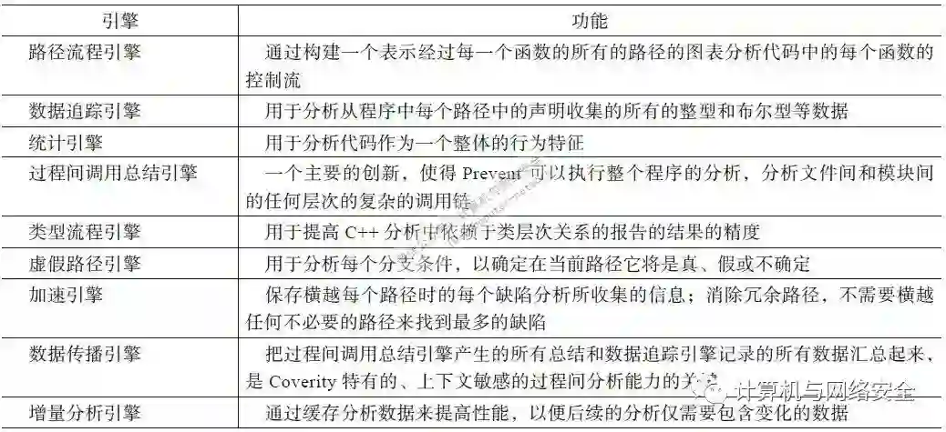 表1 Coverity的分析引擎Prevent包含的组件和功能