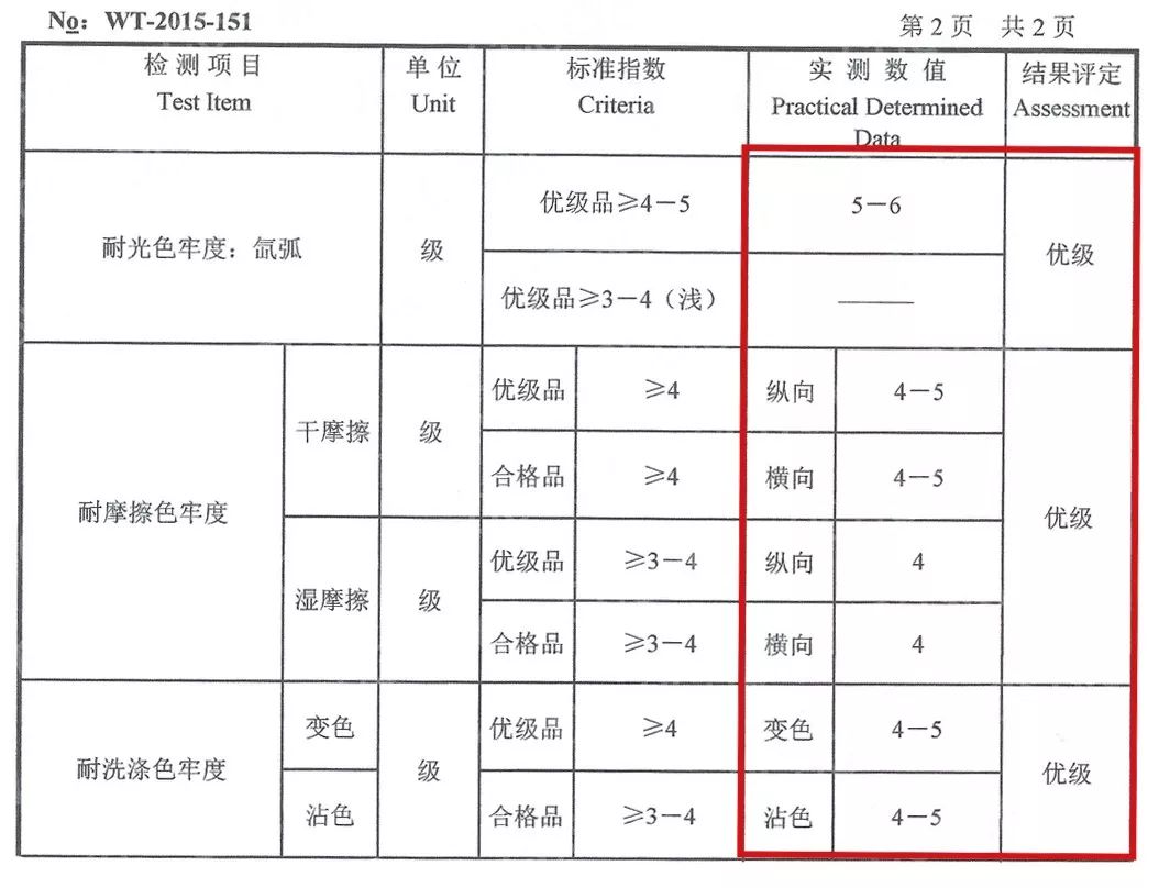 注:色牢度测试级别为:优级、良级、合格、不合格。