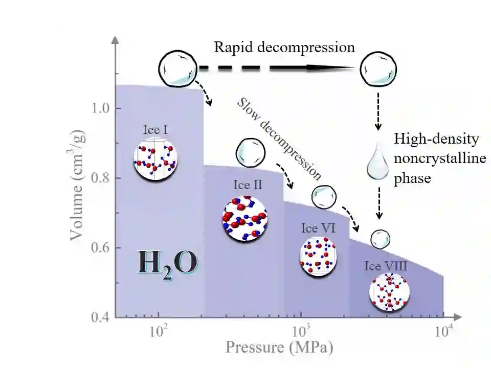 在静态加载条件下,通常我们看到的冰(又称为冰的第一相,ice I)会直接转化成冰的第二相(ice II)。而在快速压缩的过程中,冰的第一相先转化成高密度玻璃态或液态水,在进一步压缩时转化成冰的其他晶体相。同样,在快速卸载的过程中,高密度玻璃态或液态水的晶化行为会受到抑制,其因快速卸载而来不及晶化,会直接转化为低密度水。