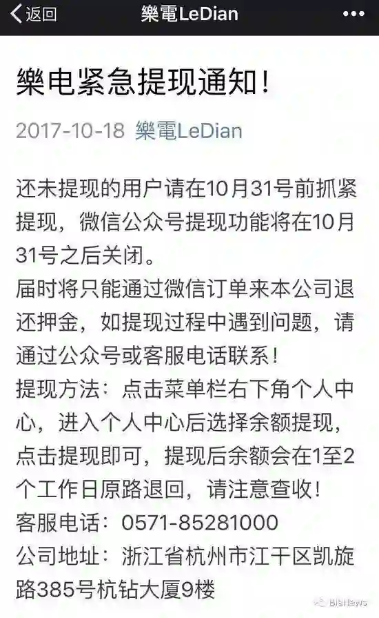@新浪科技【 “乐电LeDian”停止运营】昨天,共享充电宝企业 “乐电LeDian”再度通过其公众号发布声明,提醒用户尽快将押金提现:“届时将只能通过微信订单来本公司退还押金,如提现过程中遇到问题,请通过公众号或客服电话联系! 还未提现的用户请在10月31号前抓紧提现,微信公众号提现功能将在10月31号之后关闭。”