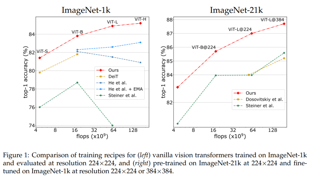 通过这种改进的训练过程,vanilla ViT 缩小了与最近最先进架构的差距,同时通常能提供更好的计算 / 性能权衡。作者提出的模型在附加测试集 ImageNet-V2 [39] 上也相对更好,这表明他们训练的模型比先前的大多数工作能更好地泛化到另一个验证集上。
