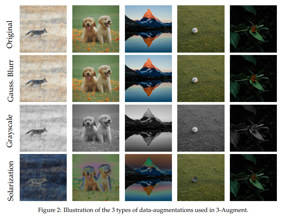 对于每张图像,他们以均值概率来选择其中一个数据增强。除了这 3 个增强选项之外,还包括常见的颜色抖动和水平翻转。图 2 说明了 3-Augment 方法中使用的不同增强。