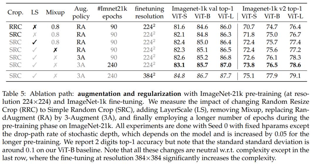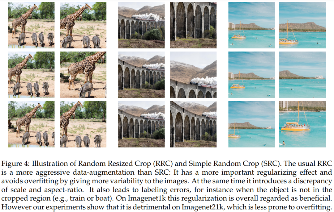然而,这种裁剪策略在训练图像和测试图像之间引入了一些长宽比和物体的明显尺寸方面的差异 [53]。由于 ImageNet-21k 包含更多的图像,不太容易过度拟合。因此,研究者质疑强 RRC 正则化的优势是否能够弥补在更大数据集上训练时的缺点。