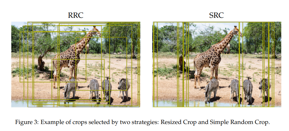 图 3 显示 RRC 和 SRC 采样的裁剪框。RRC 提供了很多不同大小和形状的裁剪框。相比之下,SRC 覆盖了整个图像的更多部分并保留了纵横比,但提供的形状多样性较少:裁剪框显着重叠。因此,在 ImageNet1k 上进行训练时,使用常用的 RRC 性能更好。举个例子来说,如果不使用 RRC,ViT-S 上的 top-1 准确率会降低 0.9%。
