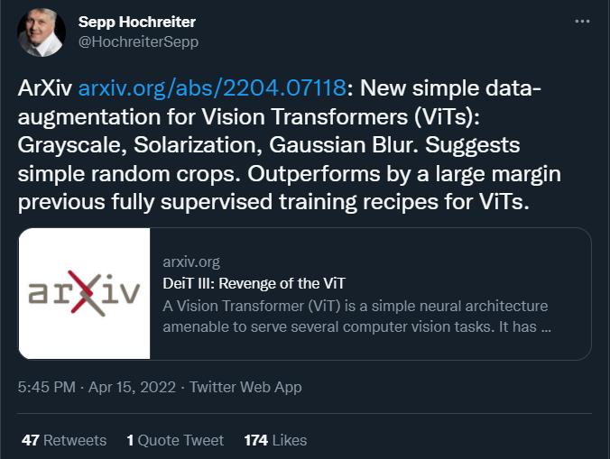 自从 AlexNet 出现以来,用于训练神经网络的数据增强流程有几次重大的修改。有趣的是,相同的数据增强,如 RandAugment [6],被广泛用于 ViT,而他们的策略最初是为了卷积网络学习而产生的。鉴于这些架构中的架构先验和偏差是完全不同的,增强策略可能无法适应,并且考虑到选择中涉及的大量选择,可能会过拟合。因此,研究者重新审视了这个先验步骤。