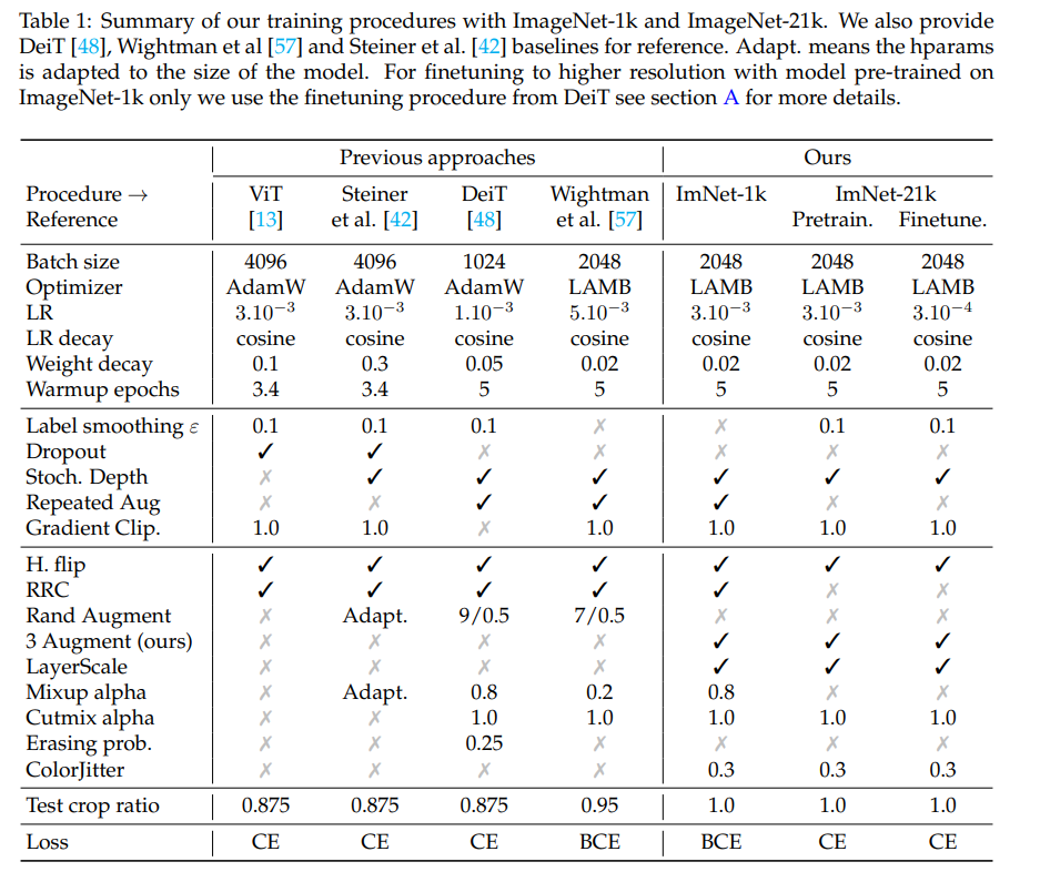 在本节中,研究者介绍了视觉 Transformers 的训练过程,并将其与现有方法进行比较。他们在表 1 中详细说明了不同的成分。基于 Wightman 等人 [57] 和 Touvron 等人 [48] 的工作,作者介绍了几个对最终模型精度有重大影响的改动。![]()