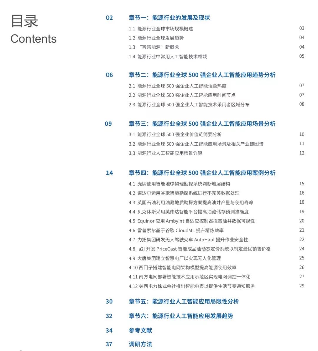 。报告中基于化石能源、电力能源划分了两大人工智能应用领域,并归纳了多个人工智能应用落地场景,更囊括多家能源行业全球 500 强企业案例,从技术与落地层面详细剖析各企业人工智能领域应用。报告目录如下: