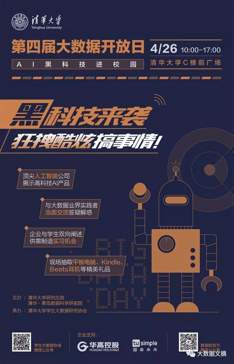 在清华大学107周年校庆、清华-青岛数据科学研究院成立4周年之际,为了让校内外师生更加了解大数据,领略大数据的魅力,数据院联合校研究生院于2018年4月26日举办“清华大学第四届大数据开放日(Big Data Day)”活动。