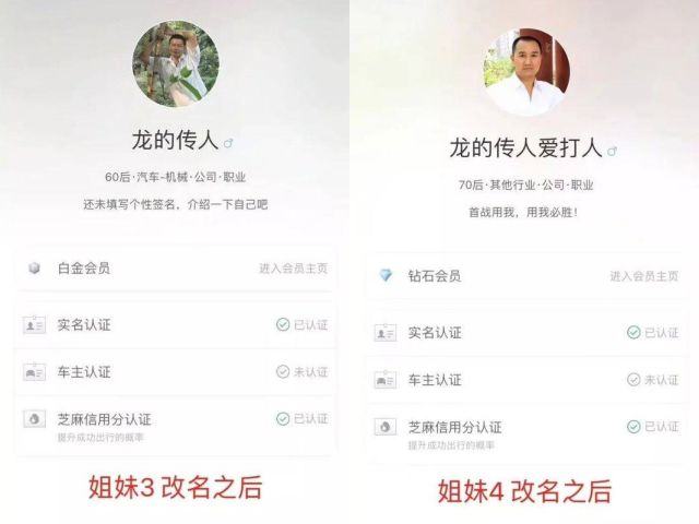 本来一个个都是“小仙女”“小公主”“小可爱”们,画风一改,突然变成了“退伍军人”、“拳击馆馆长”、“龙的传人”…… 这大概是姑娘们能想到的最具安全感形象了,大多数人把名字和职业都改成了这些,并且配上了外表很刚硬的中年男子照片,以求平安。