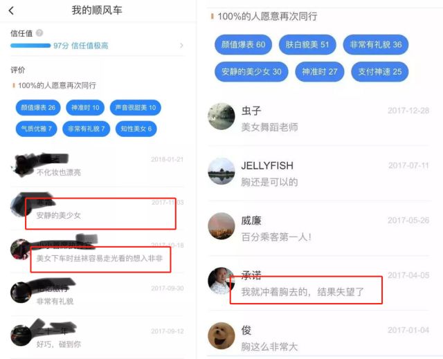 “非常准时”、“颜值很高”、“很有礼貌”的评论还算正常,而有些评价实在太过露骨。“安静的美少女”、“美女下车时丝袜容易走光看的想入非非”、“我就是冲着胸去的”等非正常评论充斥页面,但滴滴并未做任何管控,留下了安全隐患。