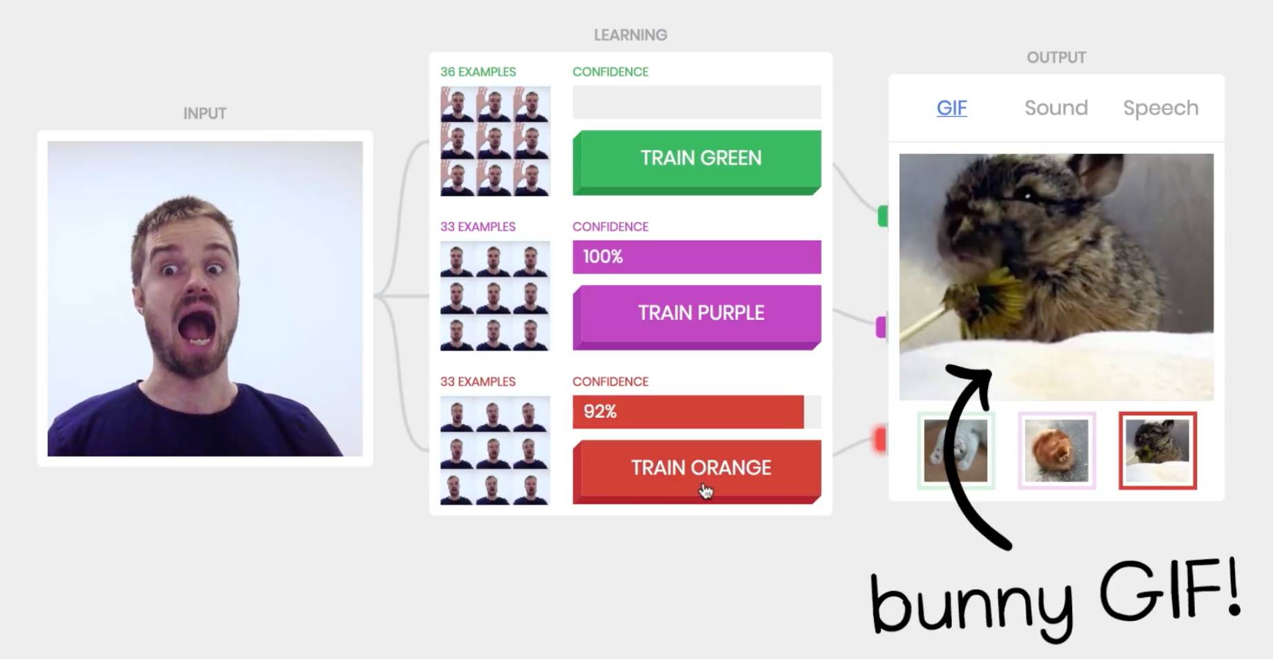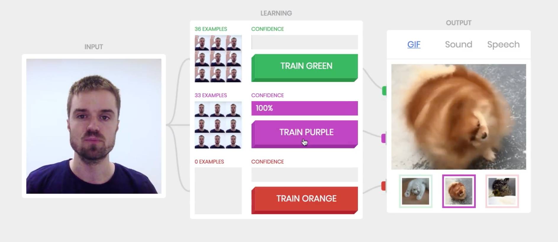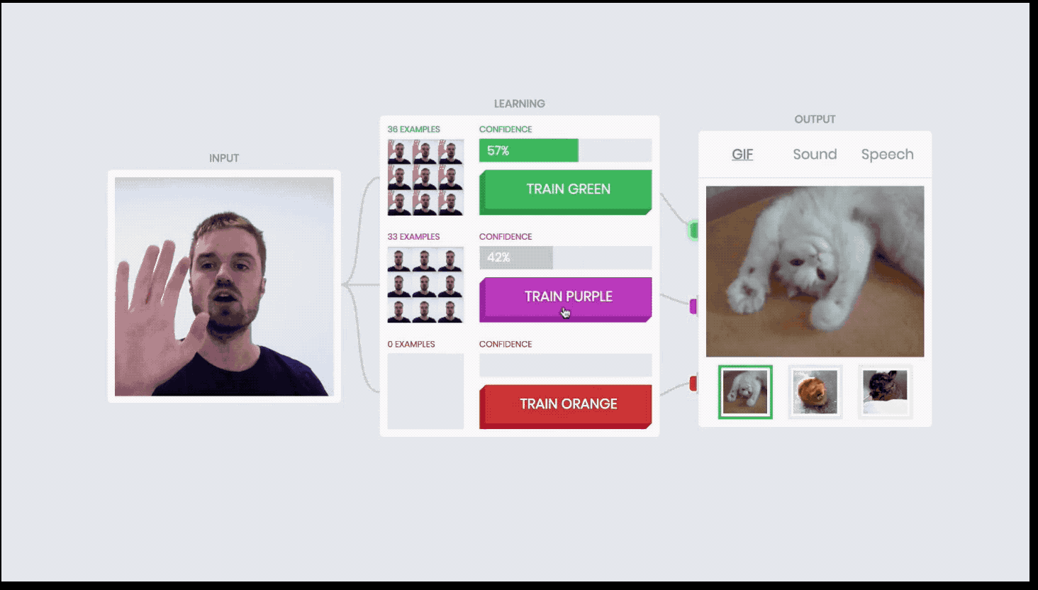 训练过程非常简单。如上图,最左侧是输入框,摄像头实时记录着你的动作、表情等等,作为训练的“输入”;中间是学习框,可以根据不同的输入分成不同的类别;右侧是输出框,可以根据不同的输入,按照不同的类别训练相应的输出结果。