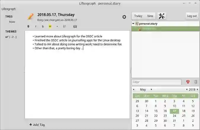 Lifeograph[3] 与 RedNotebook 有相似的外观和感觉。它没有那么多功能,但 Lifeograph 也够了。
