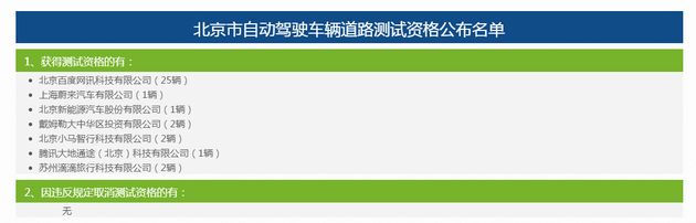 名单显示,北京目前已有7家企业获得测试资格,两家传统主机厂为北汽新能源和戴姆勒,其他3家互联网科技公司为百度、蔚来、小马智行。迄今为止,测试车辆最多的为百度,达到25辆。