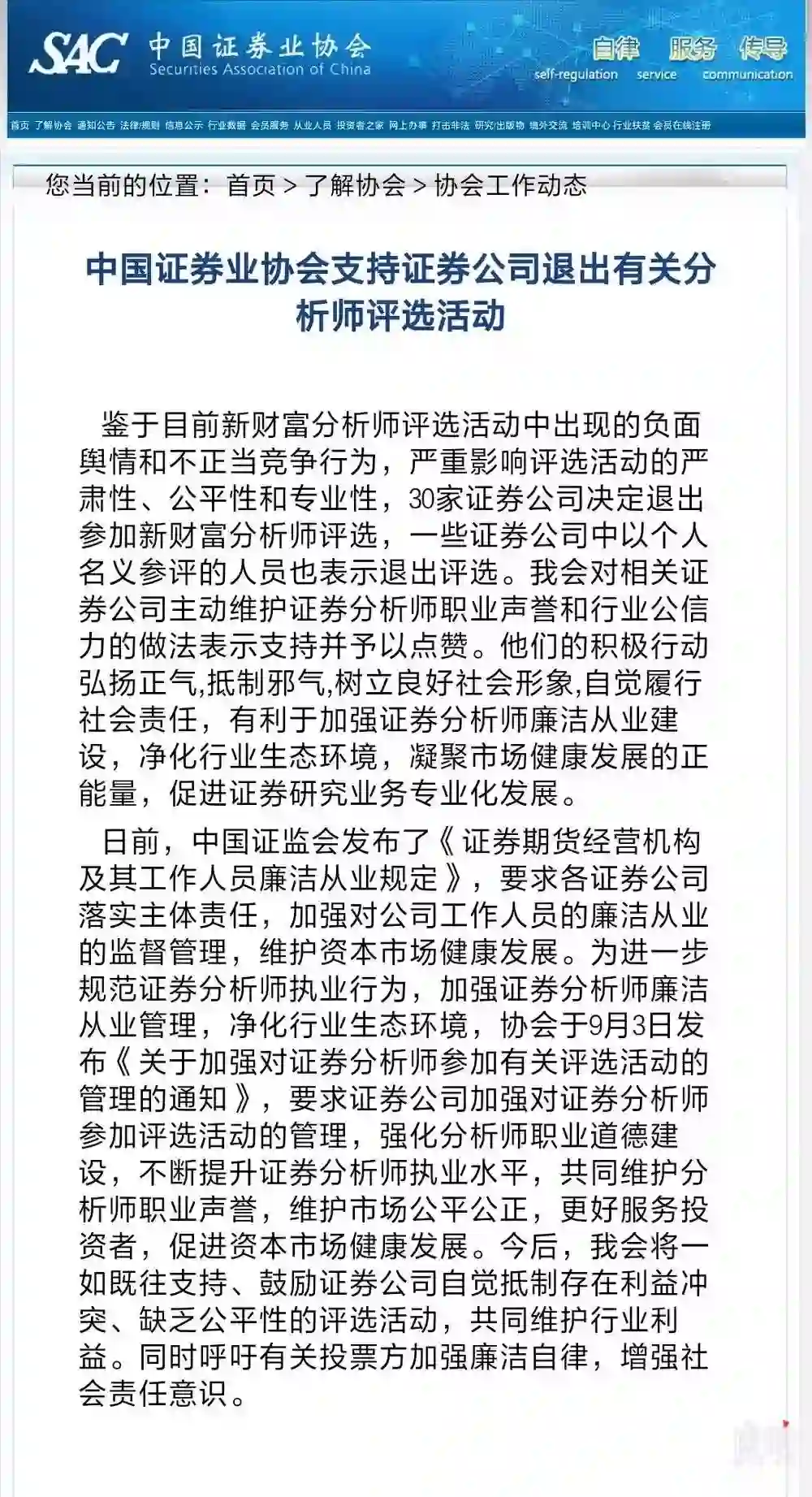 中国证券业协会发布公告,支持证券公司退出有关分析师评选活动,对这种行为予以“点赞”。