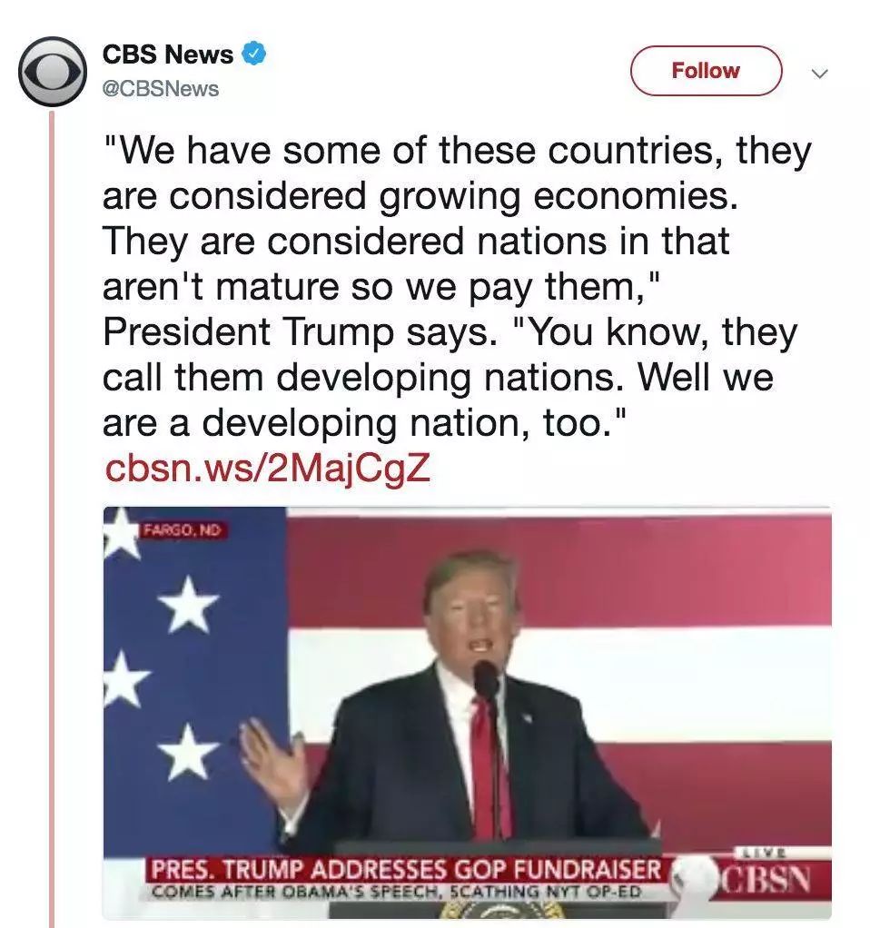 据美国媒体CBS报道,日前,在美国北达科他州法戈市的一场募款集会中,美国总统特朗普发表了一番演讲。他说道,“有一些国家被认为是发展中的经济体。因为他们还不够成熟,所以我们给他们支付补贴。他们把自己放在发展中国家的类别下,而我们不得不给他们钱,这整件事非常疯狂。比如中国,印度,还有其它一些国家。我们要阻止这件事,必须要阻止!”