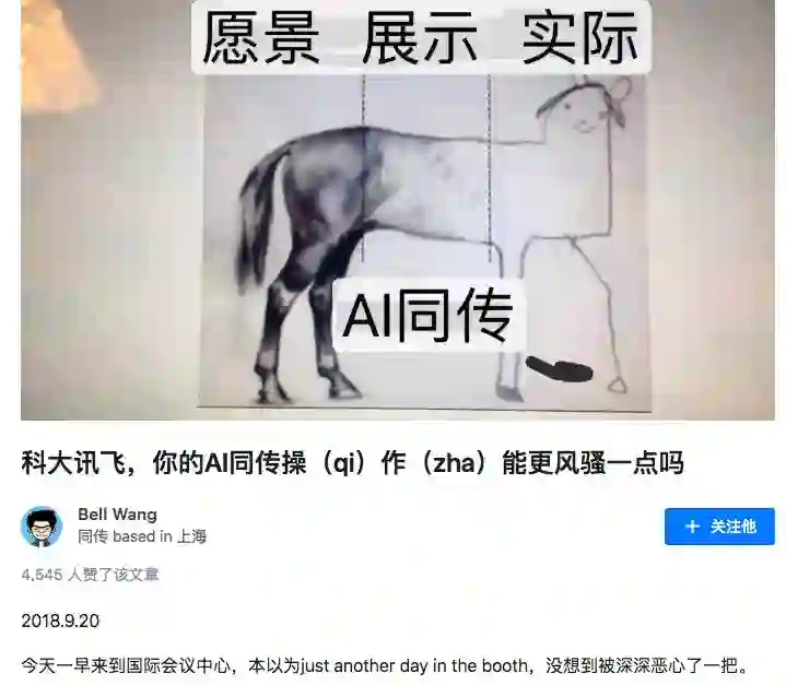 日前,有同声传译员在知乎爆料称,在近期举办的一场国际会议上,科大讯飞的AI同声传译其实是“复读”人工翻译的结果,而且“复读”并不准确,错误频出。这位网名为Bell Wang的网友表示:“所谓的智能翻译,就是按照文本读,而且是不管语义群分割的,文字显示也并不是语义群同时显示或锁定的,那就很显然是在识别语音,而不是根据原文在翻译。”