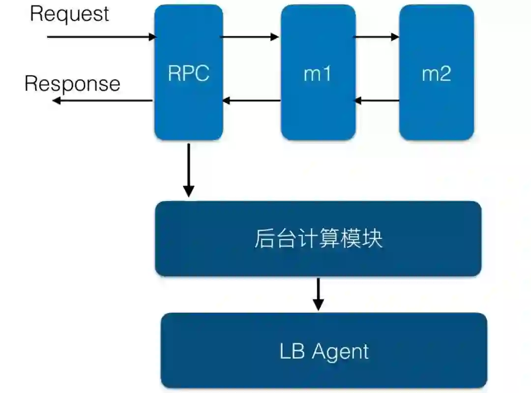 在图中,经过rpc模块,就会收集rpc模块中的统计信息;经过m1、m2模块时,也会一起收集m1、m2模块的信息;最终在返回用户前,异步地把信息推送到一个后台计算模块,这个模块会在后台用很少量的资源来汇总这些信息,并定期把信息推送给LBAgent。