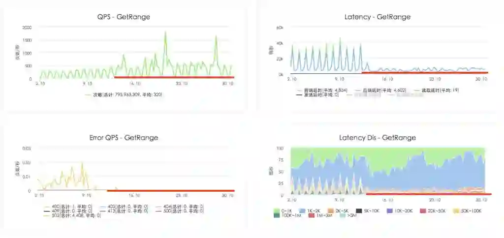 如下图所示,负载均衡系统上线后,读操作的错误率和延时明显降低,吞吐量明显提高:
