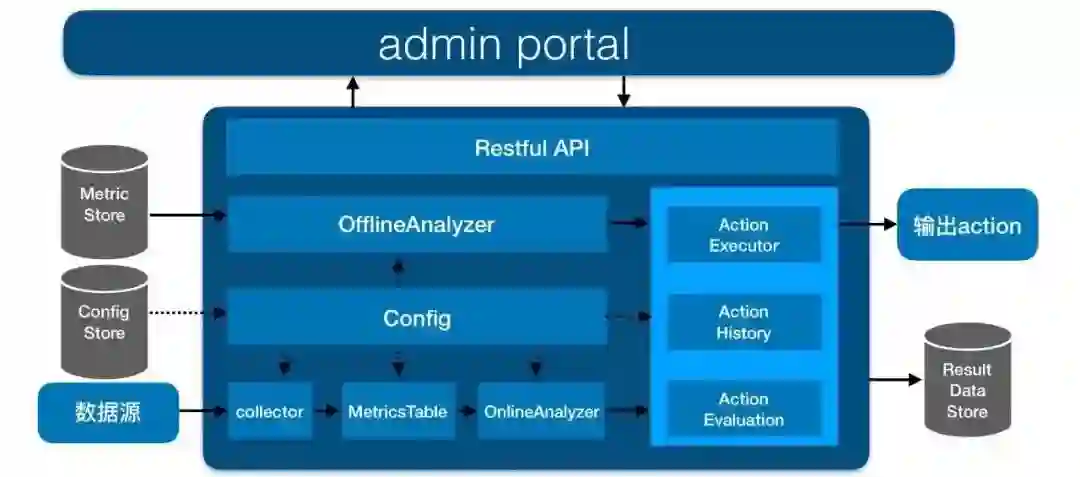 collector负责收集信息,MetricsTable负责多维度信息的top查询,OnlineAnalyzer和OfflineAnalyzer模块分别分析在线实时信息和离线信息,ActionExecutor模块负责执行分析模块产出的action。