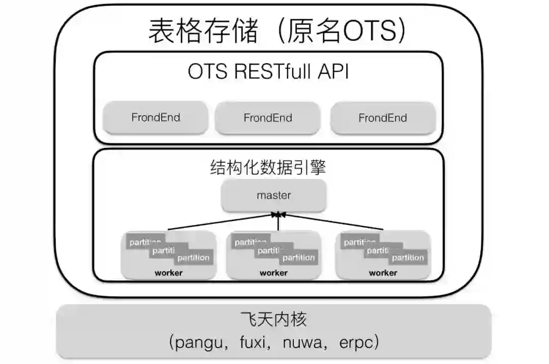 从下往上看,表格存储是基于飞天内核的产品,飞天内核主要提供了分布式共享存储、分布式锁服务、通信组件等基础功能。
