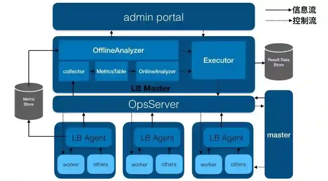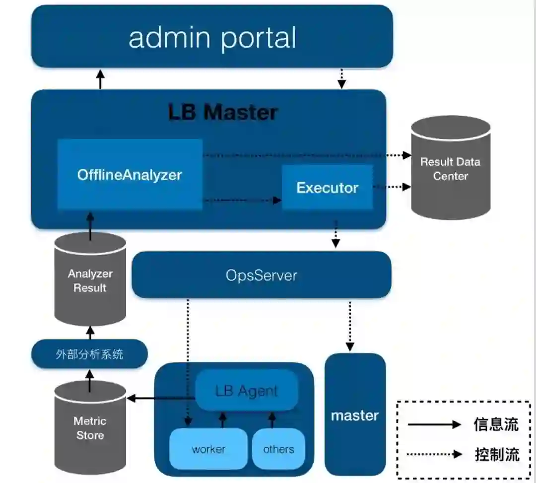 同时,LBMaster还有一个离线分析模块(OfflineAnalyzer),这个模块主要从外部存储系统MetricStore中读取信息,并对这些信息进行分析,以检测系统中是否有潜在问题,如果有,则对这些问题产生相对应的action,同样通过OpsServer交给worker或者master来执行,最终解决潜在的问题,做到防患于未然。