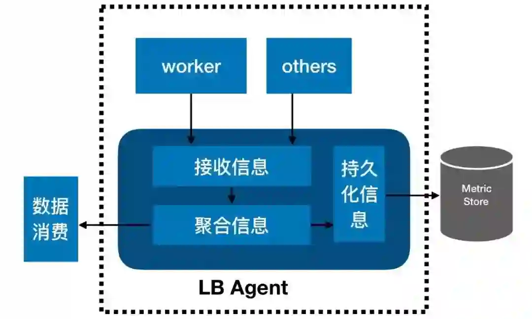LBAgent端的接收信息模块不仅会收到worker进程的信息,还会收到系统中其他相关进程的信息。收到信息之后,LBAgent在内存中维护近期收集的信息,同时异步地将信息持久化到外部存储系统(MetricStore)中,以保存更长时间。LBMaster通过接口周期性地获取LBAgent内存中维护的信息。
