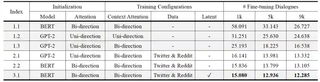 为了解决第一个问题,PLATO在通用预训练模型BERT的基础上进行了较大规模对话领域数据(Twitter & Reddit ~8.3M)的二次预训练,并且在下游特定种类的对话数据上进行了微调。其中,领域二次预训练起到了关键作用。