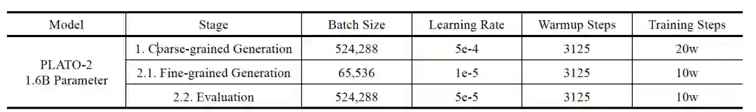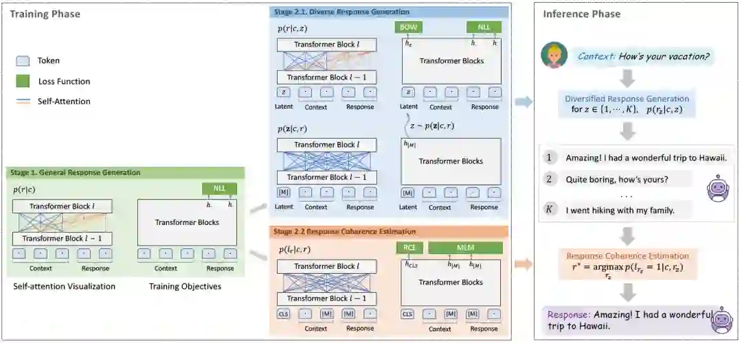 遗憾的是,从头开始直接放大PLATO-1代使得训练很困难。原文中并没有直接做量化的实验告诉我们有多困难或者效果损失有多严重,仅有文字表明会遇到训练不稳定和效率的问题。因此,二代采用了课程学习的思路,第一阶段,走“One-to-one”的粗粒度路线,走的是上下文双向编码,回复单向生成的经典结构。试图捕捉到典型的规律、通用的概念,结果上更倾向于得到安全的回复。第二阶段,正式引入了离散隐变量网络,走“One-to-many”的细粒度路线,目标多样回复生成。第三阶段,训练评估模型,用来学习回复的一致性从而选择最合适的回复,评估部分独立出来是为了免除多种任务的干扰。