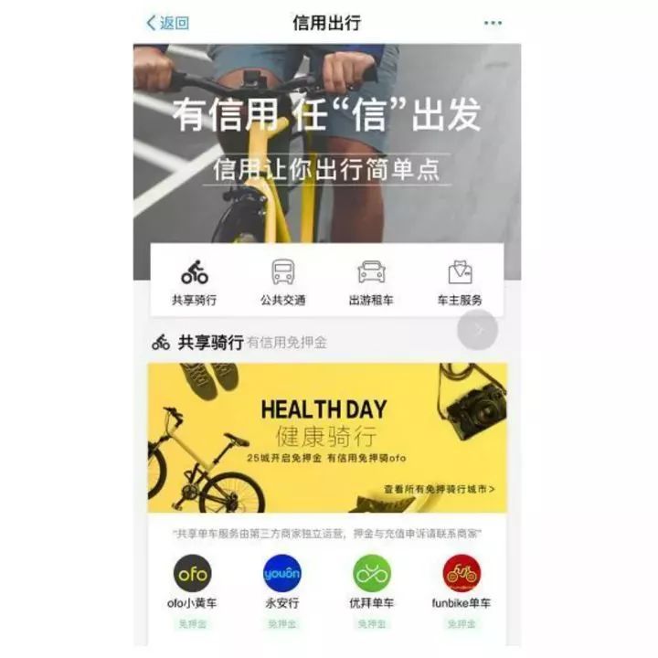 比如,在信用免押方面,小蓝等共享单车倒闭导致押金无法取出的事件固然是舆论焦点;但同时,对共享产品的使用,如无法确保用户信用,也会引发破坏和无处追责等问题。当然,从用户体验的角度来分析,押金本身是一个破坏体验的中间介质,无论是腾讯信用分还是芝麻分,都旨在创造一种信用条件下极致、快速的互联网体验,在绝对可信的环境下,是可以让物品所有权转让、使用权过渡先行的,支付行为可以后续完成。同时,信用免押也正好符合小程序用完即走的理念,在 90% 的共享单车都已经宣布接入小程序之后,「腾讯信用分」可以为用户带来更易于接受的使用体验。
