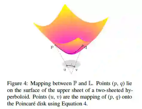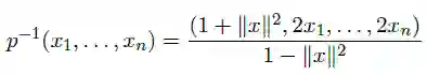 由于两个模型的等效性,我们可以在两个空间之间定义一个映射,以保留所有属性, Lorentz 模型中的点可以映射到Poincar´e-ball中: