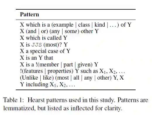 Hearst中的主要思想是利用某些词汇句法模式来检测is-a关系,比如:NPy such as NPx,或者NPx and other NPy表示的就是is-a关系。将名词短语视为有向图节点,通过使用非结构化文本和有限的先验知识来构造Hearst图,Table1中列出了本文中使用的句子模型,用E={u,v}来表示获取到的上下位词对,用w(u,v)来表示它们之间的关系。