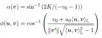 为了在Lorentz 模型上定义entailment cones,必须在L^n上推导a(v)和φ(u,v),我们可以从余弦的双曲定律和P与L之间的映射获得: