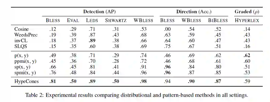 在自然语言处理中,从文本中检测“is-a”关系是一项长期的任务。一种流行的方法是利用Hearst(Hearst,1992年)首先提出的高精度词汇句法模式。这些模式可以预先定义或自动学习(Snow等,2005;Shwartz等,2016)。但是,众所周知,这种基于模式的方法会因缺少提取而遭受重大损失,因为术语必须以正确的关系出现才能被检测到。最近的工作通过利用搜索引擎(Kozareva和Hovy,2010)或利用网络规模的语料库(Seitner等,2016)来提高覆盖率。为了克服基于模式的方法的稀疏提取,近来的重点已转移到分布方法。这些方法减轻了稀疏性问题,但是还需要专门的相似性度量来区分不同的词汇关系。迄今为止,大多数度量都是受分布包容性假设(DIH;Geffet and Dagan 2005)的启发的,基于分布方法的无监督的方法包括WeedsPrec(Weeds等人,2004),invCL(Lenci和Benotto,2012),SLQS(Santus等人,2014)和DIVE(Chang等人,2018)。基于位置或基于依存关系的分布表示也可能捕获类似Hearst模式的粗略特征(Levy等人,2015;Roller和Erk,2016)。Shwartz等 (2017年)表明,这样的环境对于分配方法的成功起着重要的作用。最近,Roller等人 (2018)对无监督分布和基于模式的方法进行了系统研究。他们的研究结果表明,基于模式的方法在一些具有挑战性的上位基准上能够胜过基于DIH的方法。良好性能的关键方面是从大型文本语料库中提取模式并使用嵌入方法来克服稀疏性问题。我们的工作基于这些发现,将其嵌入替换为具有自然分层的几何结构的嵌入。
