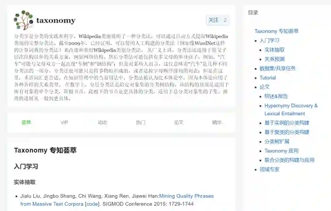 尽管探索上位词关系是一项重要且困难的任务,完整的分类归纳是一项并行且互补的任务,该领域的许多工作都将分类图作为起点,并通过多种方法来扩展分类图。