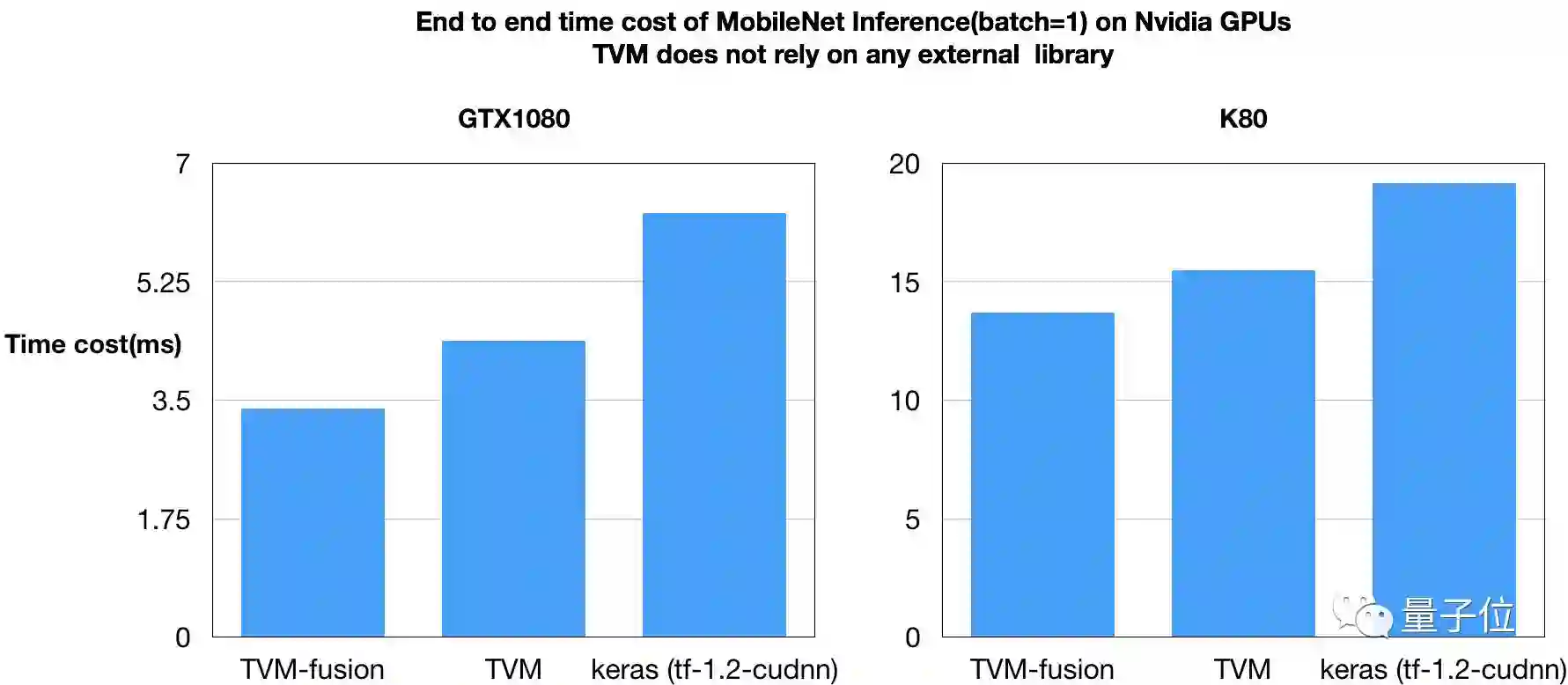 作为一个概念的证明,我们创建了一个端到端的编译流程,可以将MXNet模型编译成TVM执行图。我们通过自动融合运算符并使TVM生成融合的内核,在图形节点之间应用优化。我们对MobileNet ImageNet工作负载进行了测试,结果如下。
