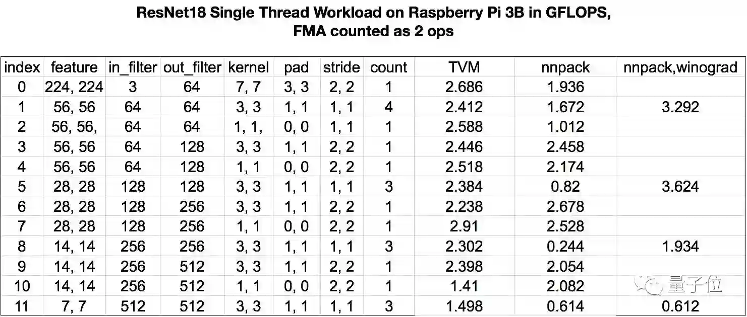 我们首先在一个树莓派3B上运行ResNet工作复杂,来比较TVM和nnpack。由于时间限制,我们使用了TVM实现直接卷积,而nnpack用于对3×3内核执行winograd卷积。