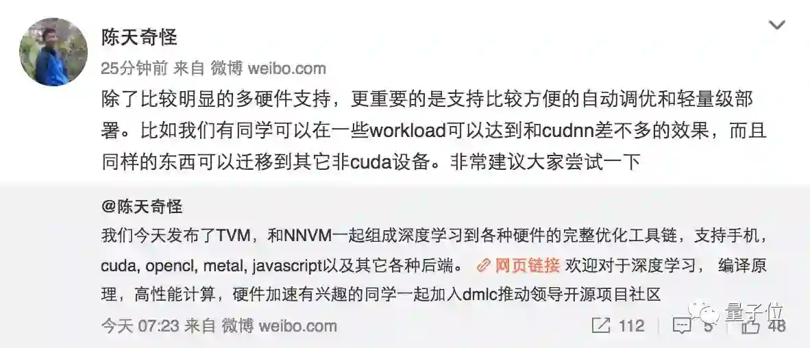 陈天奇在微博上表示,TVM和之前发布的模块化深度学习系统NNVM一起,“组成深度学习到各种硬件的完整优化工具链”。