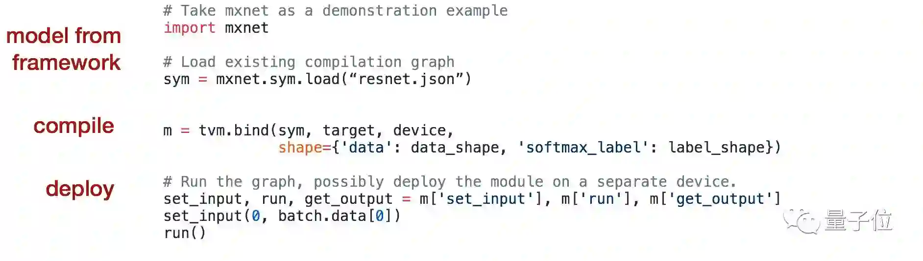 以Apache MXNet作为前端案例,下面的代码演示了如何使用TVM将深度学习模型的高级描述编译为针对目标硬件定制的优化可执行模块。