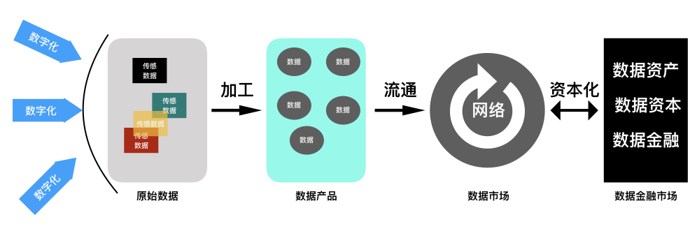 从数据流动的宏观结构观察,数字化首先形成初级的、未经处理的原始数据(Raw Data),这些原始数据是由不同的数字化设备(传感器)产生的“传感数据”(Sensor Data),经过简单的组合或融合而形成的。这些原始数据再经过处理,形成各种各样的数据产品(Data Products),进入数据交易市场。数据资本化进程的演进,逐渐形成包括数据资产、数据资本和数据金融的数据金融市场(如下图)。由此可以看出,数据必然的成为可进行交易的商品、必不可少的生产要素与资产。数据资产列入资产负债表,也只是时间问题。