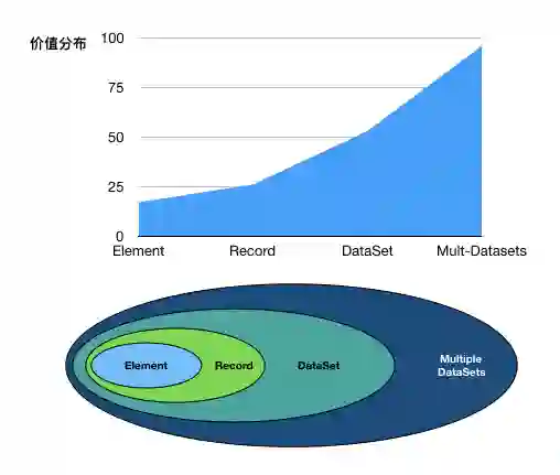 从数据的层级结构(NIST)考察,可以发现不同层级的数据对于整个数据集的价值贡献是不同的。大数据科学揭示出来的一个显著的特性就是,高层级数据包含更丰富的信息,因此对于数据价值的贡献也更多。由此,可以建立一个基于数据层级结构的价值树(Value Tree)模型:高层级的数据具有更高的权重,价值在不同层级的分布是不均匀的(示意图如下)。这种定价方法,需要确定价值在不同层级的分布情况。这方面的定性研究已经取得一些进展,但定量的研究还处于起步阶段。