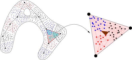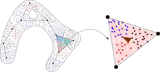 上述度量构造方法在具有很大异质性的数据集合中,暴露出很多缺陷。人们逐渐认识到“距离函数”的局限性,很多数据集本身就不存在“距离”这种结构,或者无法构造出类似“距离”的结构。采用拓扑学的方法和工具来处理这些数据就成为必要的手段,由此发展出了计算拓扑学(computing topology)。拓扑的方法是分析数据集的拓扑性质,进一步的通过计算拓扑不变量,例如洞、环等(也是一种度量)来对数据集进行比较、分类和预测(示例如下图)。