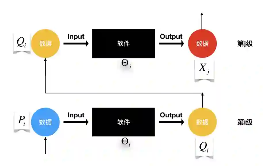 这个分析框架将数据作为软件所定义的输入空间和输出空间的子集【定义1】。数据从一个层级“流动”到上一个层级,驱动数据流动的动力是数据的价值(分析框架示意图如下)。