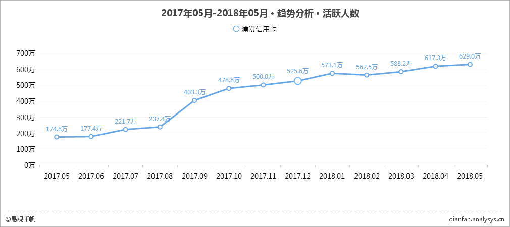 在产品迭代上,浦发信用卡APP——浦大喜奔5月上线全新5.0版本,推出服务持卡用户的“智能生活地图”功能,背后是对用户数据收集处理、分析、预测的闭环逻辑,其在获取用户实时位置的基础上,能够依据用户的消费喜好、购买习惯等维度数据,基于大数据技术提炼出精准用户画像信息,实现对用户的智能化分类,进而实现优惠商户的智能个性化推荐。对于广大消费者用户而言,其打开手机的定位服务,即可实时查看周边三公里内的优惠商户信息,购买优惠权益,或是根据导航直接前往商户,实现“一键式”直达服务,便捷性、实用性相较以往有较大提升。2018年5月,浦发信用卡APP活跃人数为629.0万,环比增长1.89%。