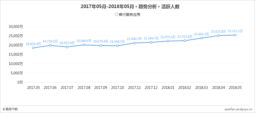 以手机银行为代表的银行APP流量入口价值日益凸显。根据易观千帆数据,2018年5月,银行服务应用行业活跃用户规模达25331.3万,环比增长1.23%。