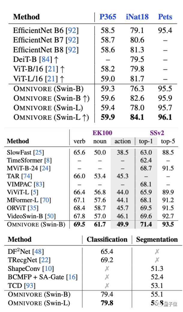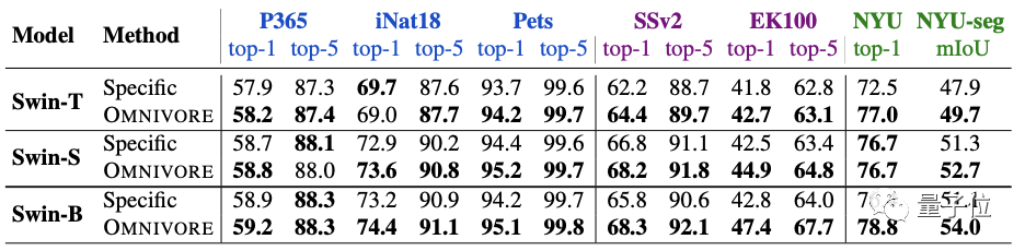 实验方面,首先将Omnivore与各视觉模态对应的特定模型(下表中指Specific)进行比较。