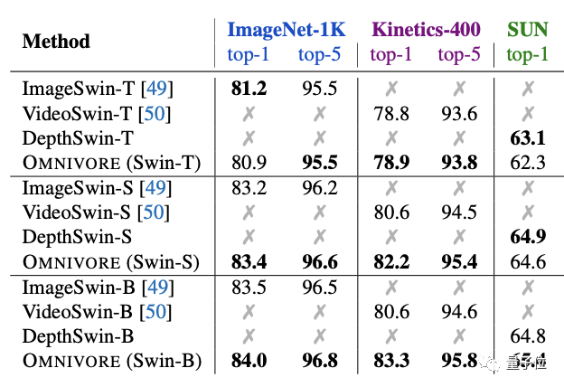 其中Omnivore在IN1K、K400和SUN数据集上从头开始联合训练,而特定模态的模型针对每个数据集专门训练: