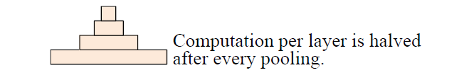 固定了 feature map 的数量,每当使用一个 size=3 和 stride=2 进行 maxpooling 进行池化时,每个卷积层的计算时间减半(数据大小减半),从而形成一个金字塔。