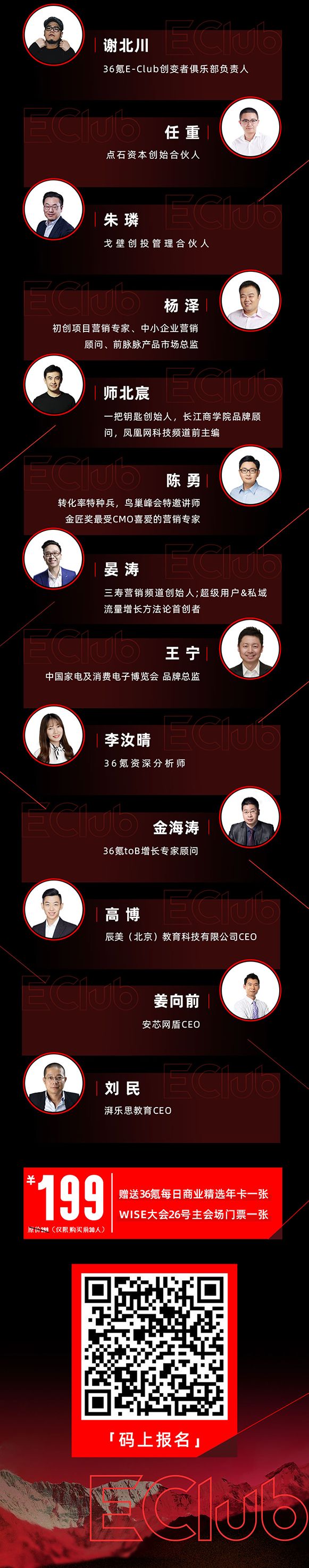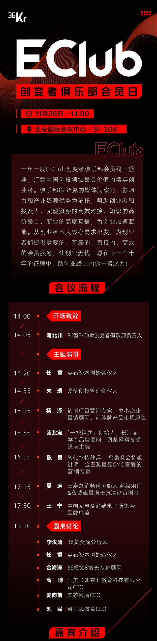 11月26日,36氪「E-Club创变者俱乐部」将在2019WISE大会现场举办首届36氪E-Club创变者俱乐部盛典。此次盛典,汇集了中国创投领域最具价值的精英创业者,除了更新创业认知,你还能现场面会:明星投资人、营销专家、资深媒体人、行业分析师以及明星初创公司创始人。和他们一起,聊聊初创企业如何破局。